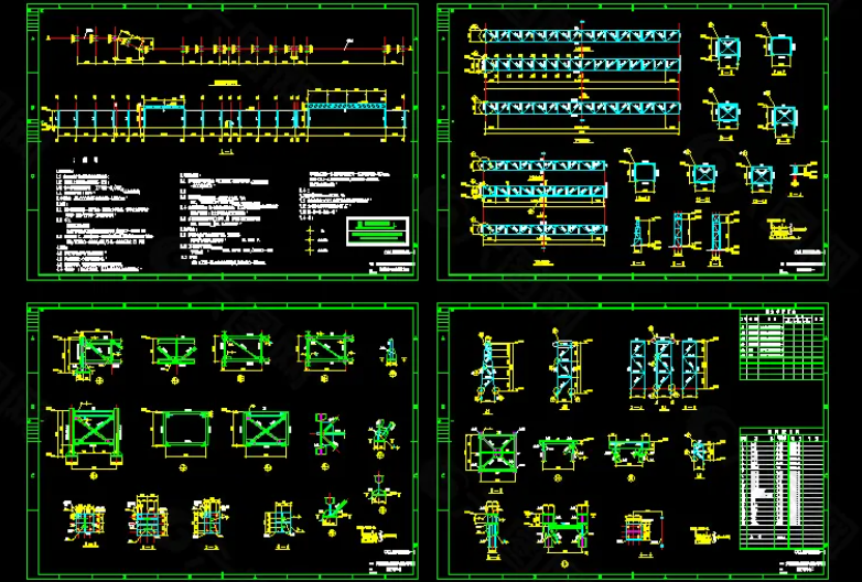 6)格构式梁、柱、支撑应绘出平、剖面(必要时加立面)、与定位尺寸、总尺寸、分尺寸、分尺寸、注明单构件型号、规格,组装节点和其他构件连接详图。